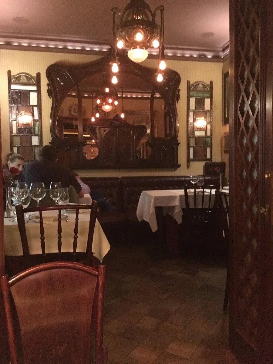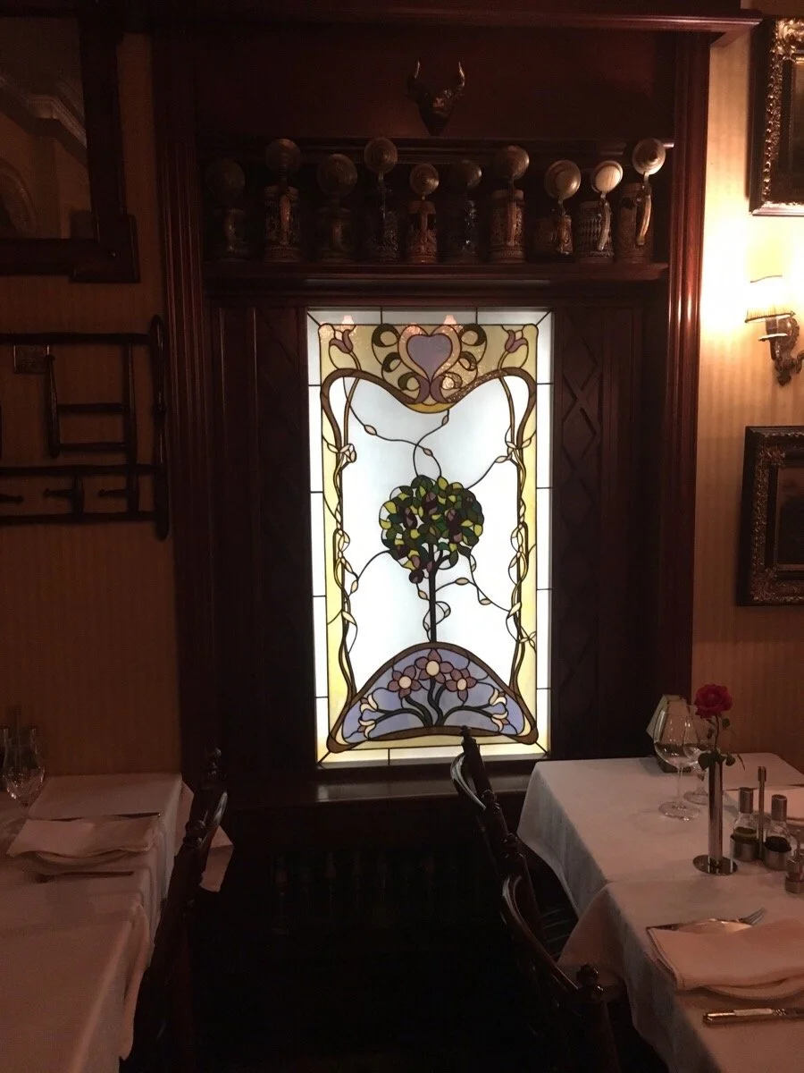 A stunning Art Nouveau stained glass installation for Restaurants “At the Corner” and “Fransh” featuring elaborate floral and figural panels, a dramatic ceiling skylight, and decorative window and partition elements. The work transforms the dining experience into an immersive encounter with the golden age of decorative glass.
