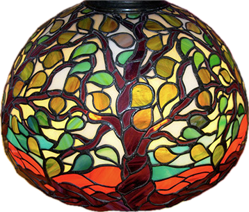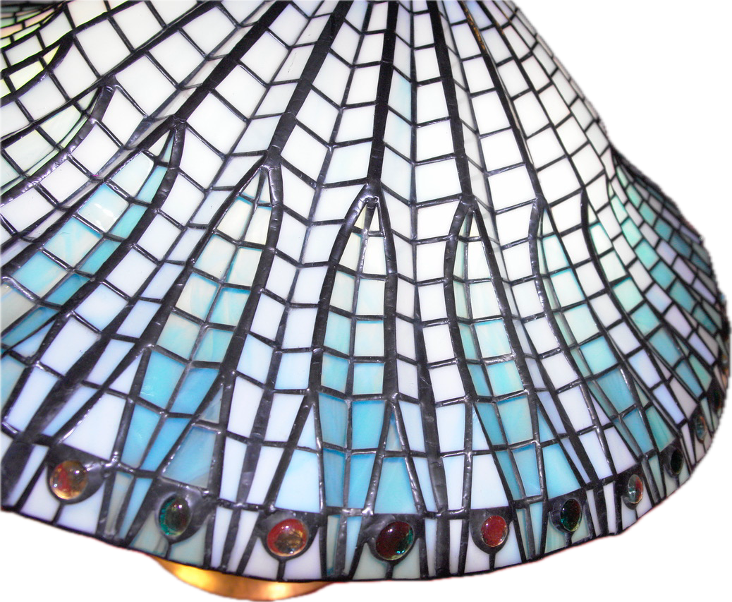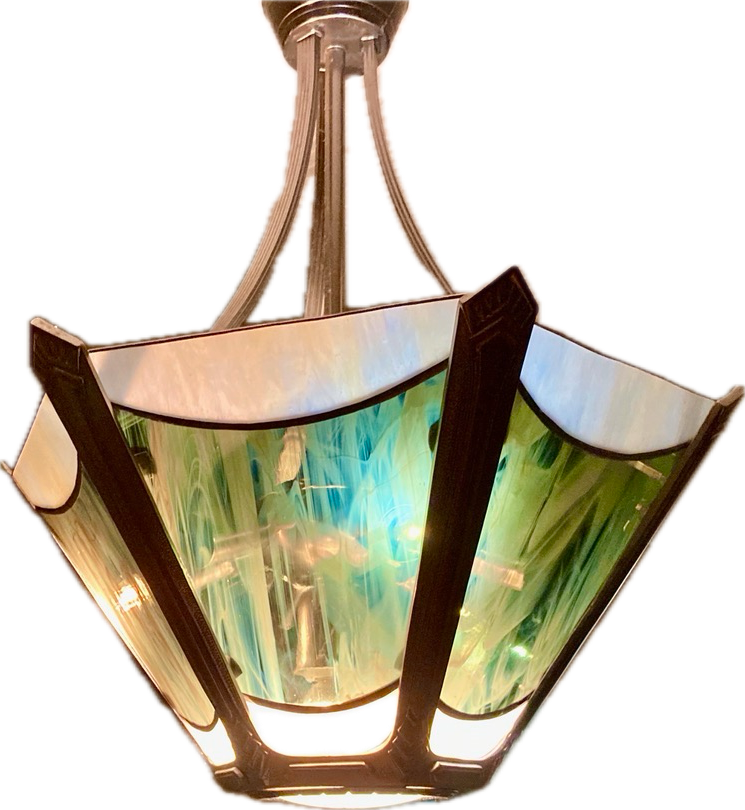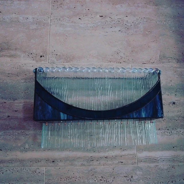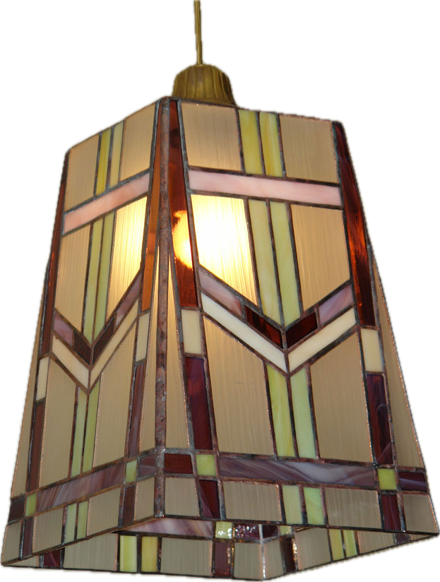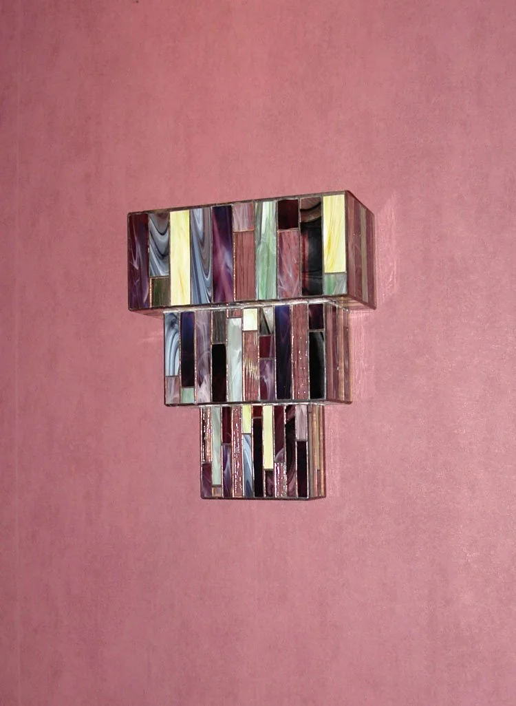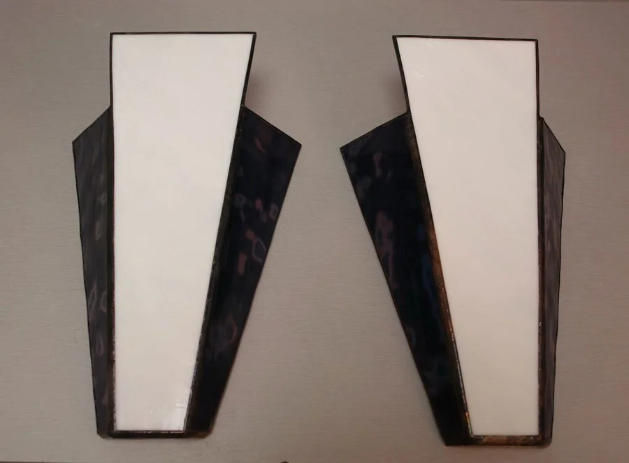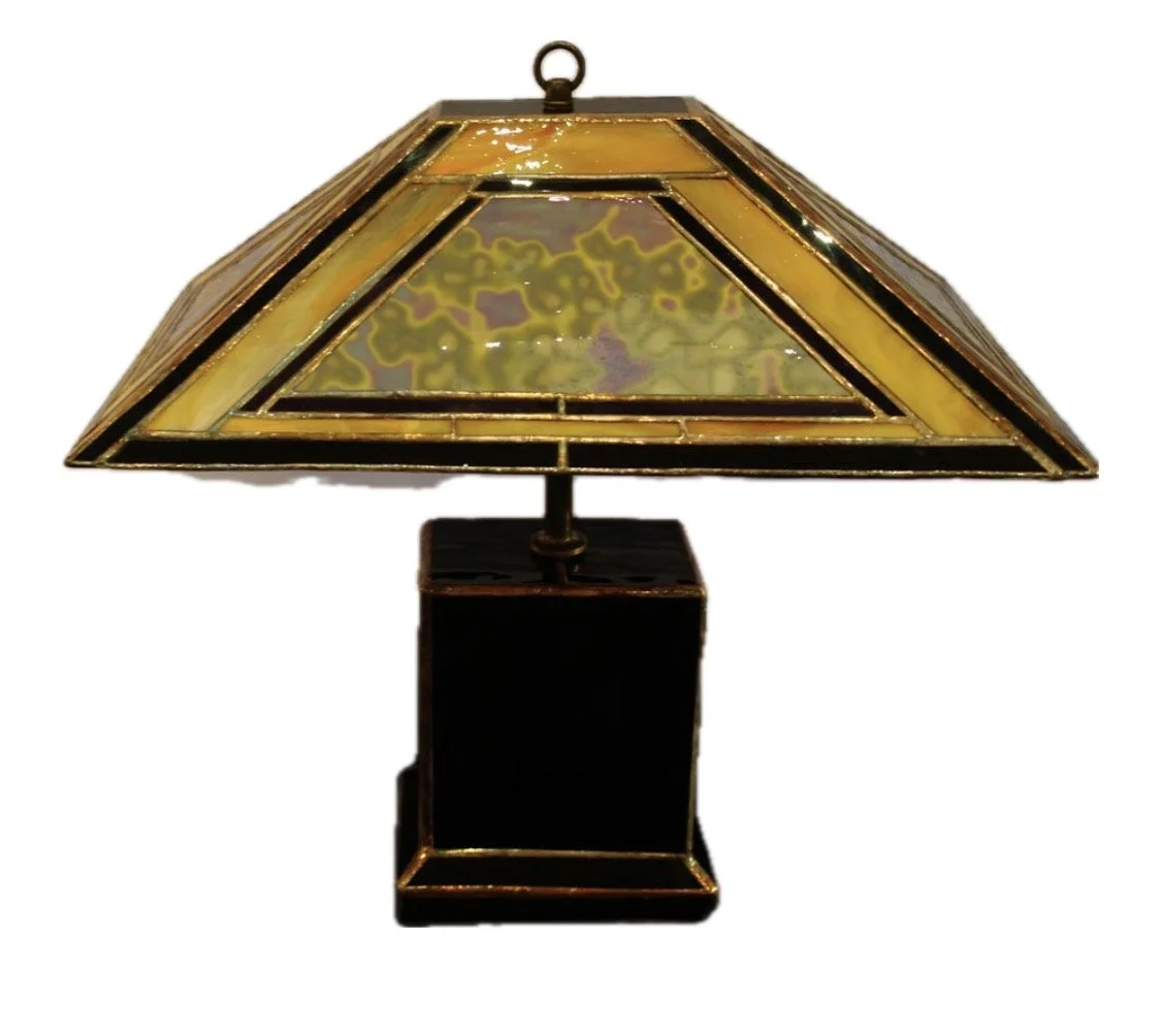 Each piece is individually designed and fabricated using traditional copper foil and lead came techniques, drawing of motifs from nature, Art Nouveau, and contemporary geometry.