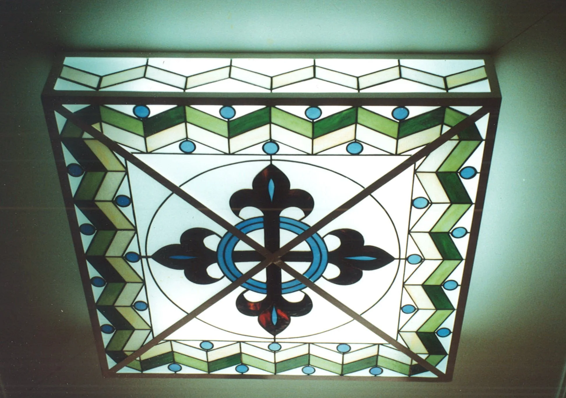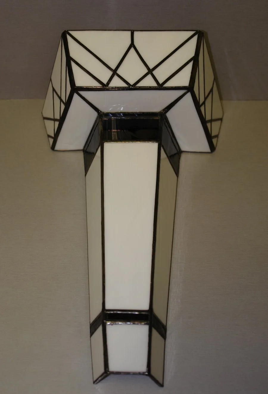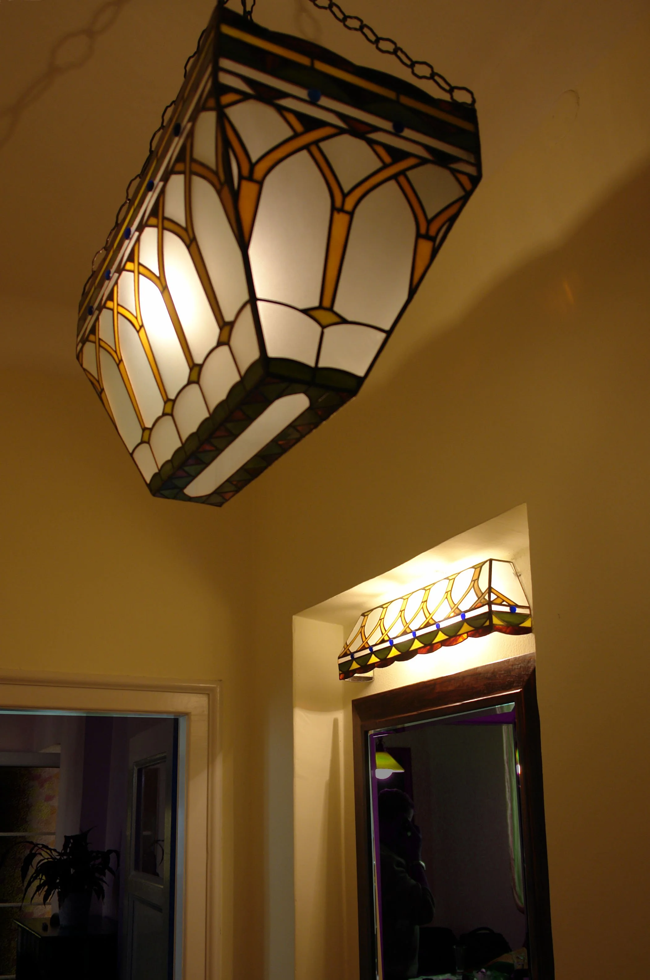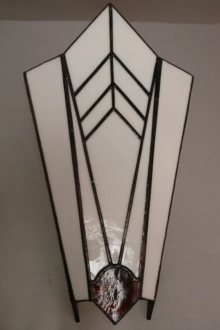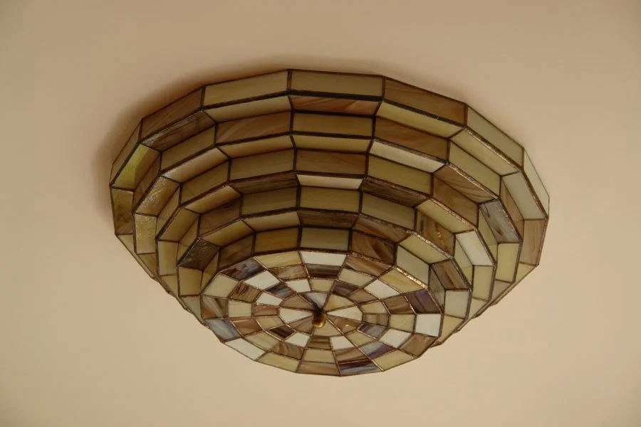 Each piece is individually designed and fabricated using traditional copper foil and lead came techniques, drawing of motifs from nature, Art Nouveau, and contemporary geometry.