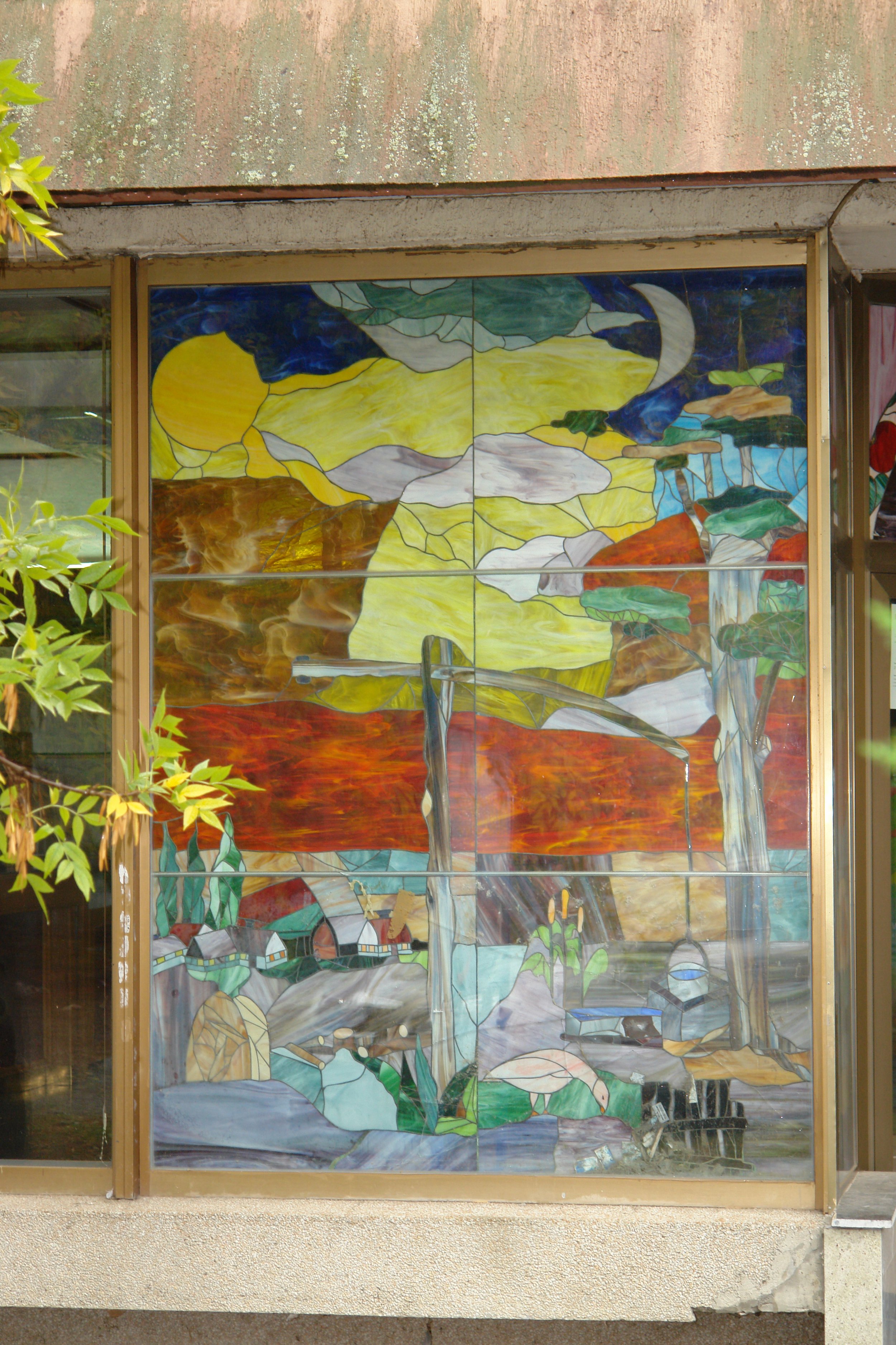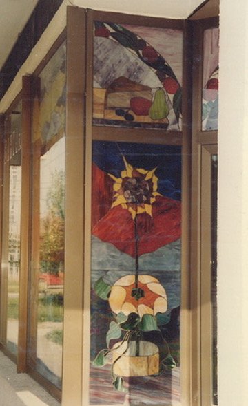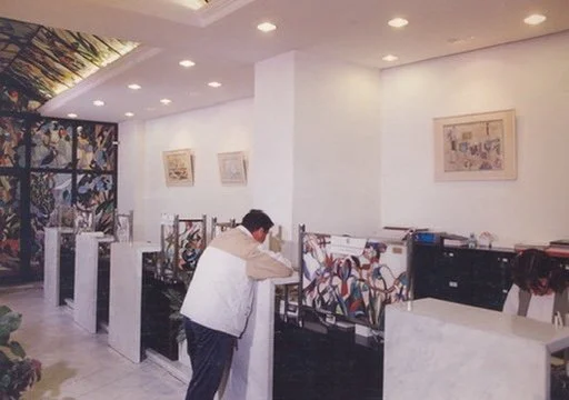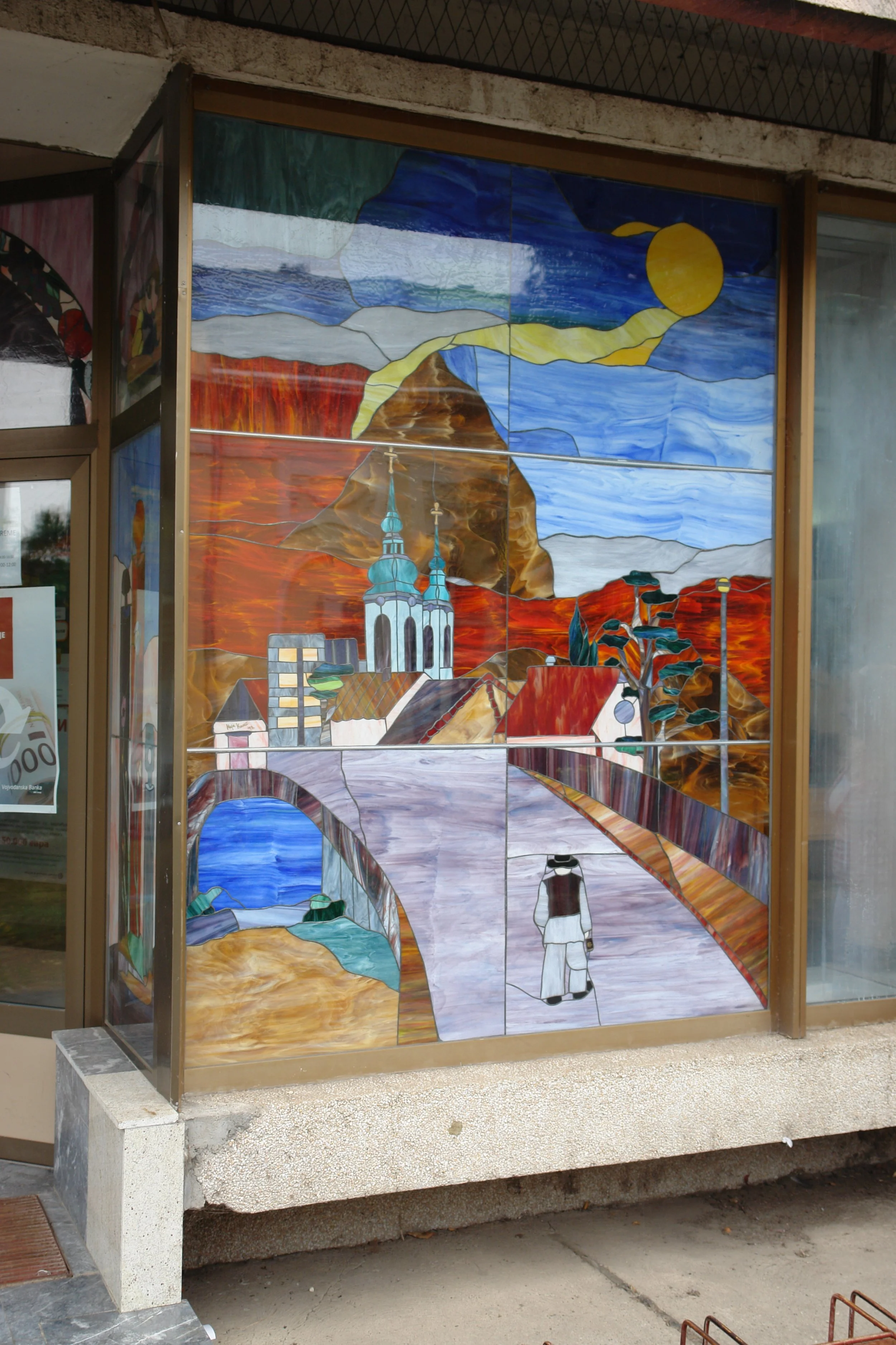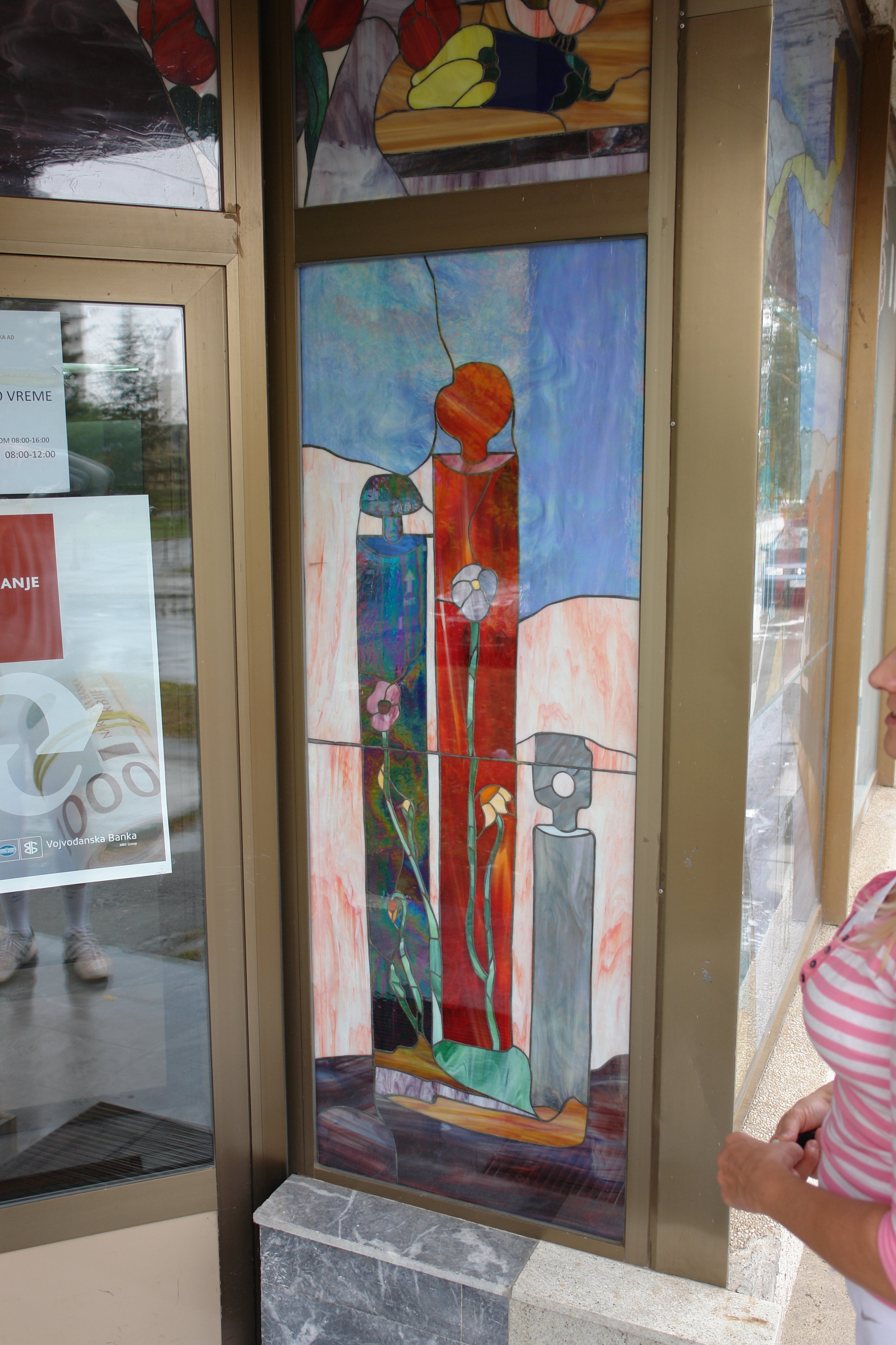 Commissioned for Vojvodina Bank, this stained glass installation transforms a space of precision and stone into a living garden of color.